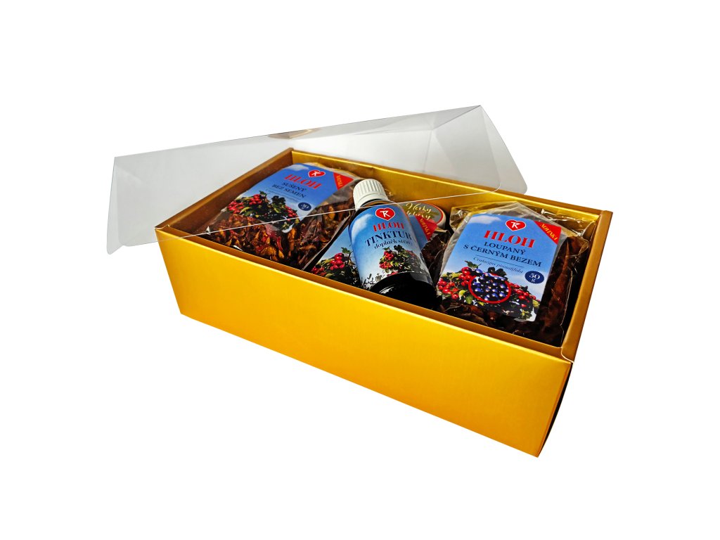To vše v papírové zlaté krabiččce s průhledným plastovým víčkem.